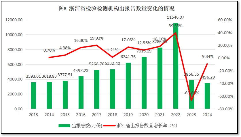 过去12年,浙江省检验检测机构对外出具检验检测报告的数量如图8所示。